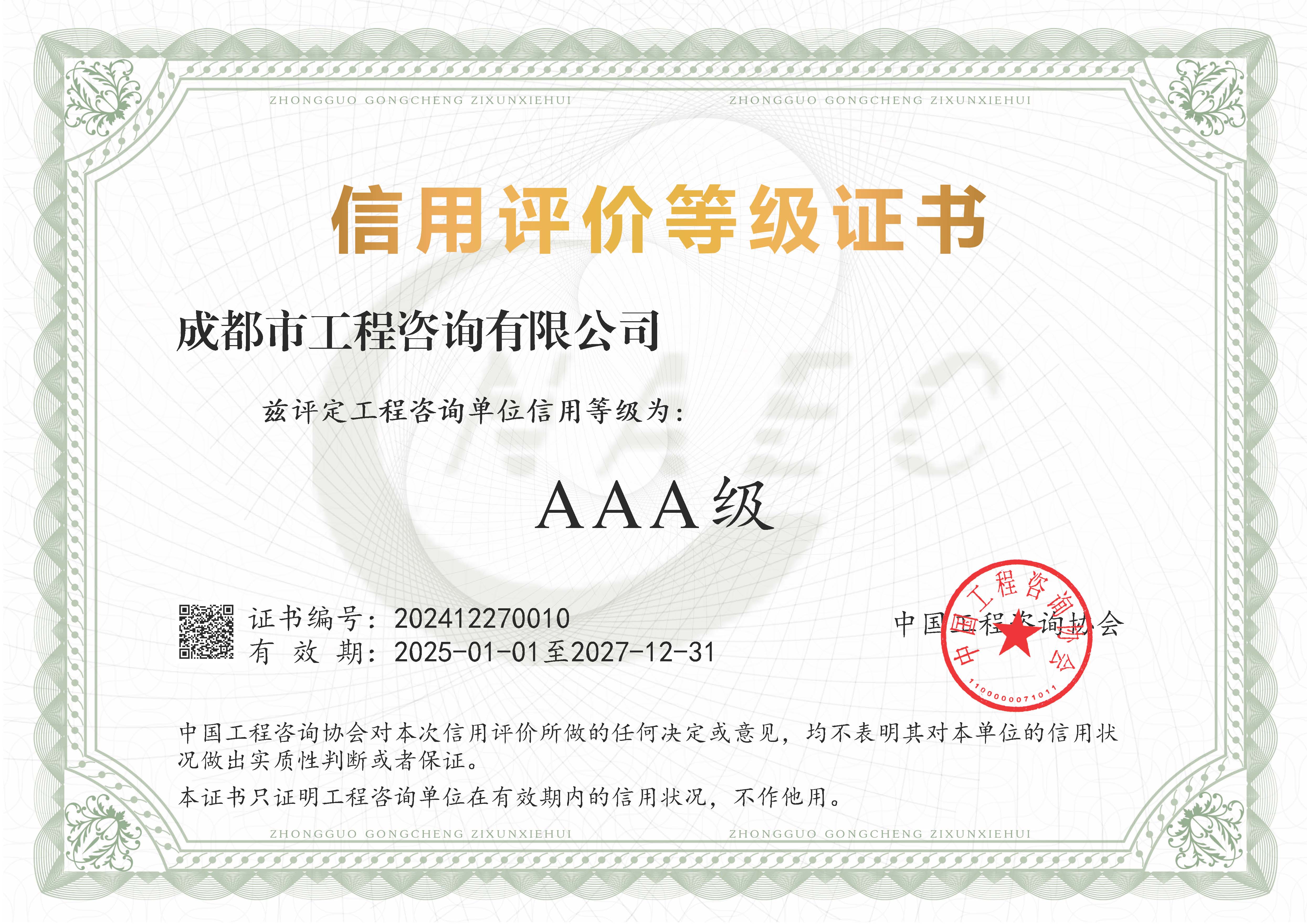 公司擁有工程咨詢甲級綜合資信、甲級專業(yè)資信和PPP甲級專項資信三項甲級資信證書和工程造價資質(zhì)。甲級綜合資信由建筑,水利水電,農(nóng)業(yè)、林業(yè),電子、信息工程(含通信、廣電、信息化),市政公用工程,生態(tài)建設(shè)和環(huán)境工程,公路,其他(節(jié)能)8個甲級專業(yè)資信和電力(含火電、水電、核電、新能源),輕工、紡織,水文地質(zhì)、工程測量、巖土工程,建材,鐵路、城市軌道交通,其他(土地整理)和其他(旅游工程)7個其他專業(yè)組成。公司現(xiàn)已通過了GB/T19001-2016/ISO9001:2015質(zhì)量管理體系、GB/T24001-2016/ISO14001:2015環(huán)境管理體系和GB/T45001-2020/ISO45001:2018職業(yè)健康安全管理體系認(rèn)證。公司目前是四川省內(nèi)唯一同時持有甲級綜合資信、甲級專業(yè)資信和PPP甲級專項資信證書的綜合性咨詢機(jī)構(gòu),是四川省及成都市發(fā)展改革部門以及天府新區(qū)、東部新區(qū)、高新區(qū)、武侯區(qū)等20余個區(qū)(市)縣的政府投資項目咨詢服務(wù)機(jī)構(gòu)。