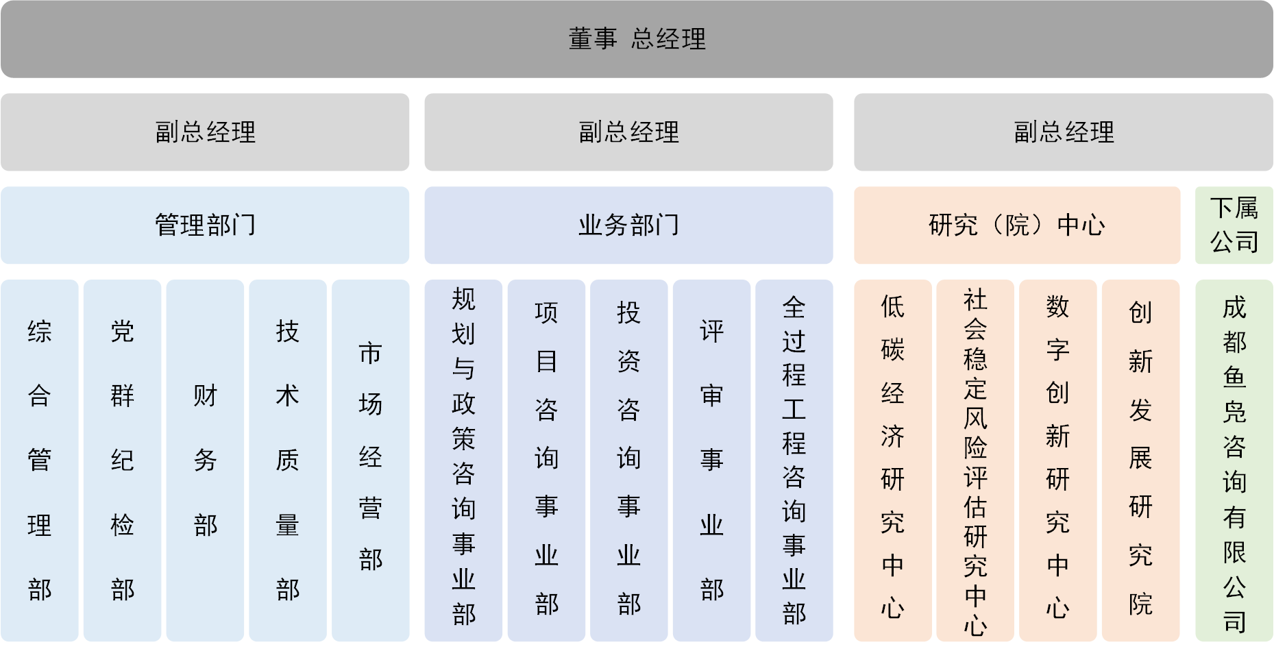 公司本科及以上學(xué)歷員工占比93%,碩士及以上學(xué)歷員工占比47%;正高級工程師7人,高級工程師28人,擁有全國咨詢工程師(投資)、全國注冊造價工程師以及注冊城鄉(xiāng)規(guī)劃師等各類專業(yè)技術(shù)資格人才占比超過65%。公司下設(shè)11個部門,4個研究(院)中心。其中,業(yè)務(wù)部門6個,包括規(guī)劃與政策咨詢事業(yè)部、項目咨詢事業(yè)部、投資咨詢事業(yè)部、評審事業(yè)部、造價咨詢事業(yè)部和項目管理事業(yè)部;4個研究(院)中心分別為低碳經(jīng)濟(jì)研究中心、社會穩(wěn)定風(fēng)險評估研究中心、數(shù)字創(chuàng)新研究中心和創(chuàng)新發(fā)展研究院。為推動行業(yè)數(shù)字化、智能化轉(zhuǎn)型發(fā)展,公司還與西南交通大學(xué)經(jīng)濟(jì)管理學(xué)院共建工程咨詢智能決策研究中心和產(chǎn)學(xué)研合作示范研究基地。公司現(xiàn)有控股子公司1家,為公司與溫江區(qū)屬國有公司合資成立的成都魚鳧咨詢有限公司。